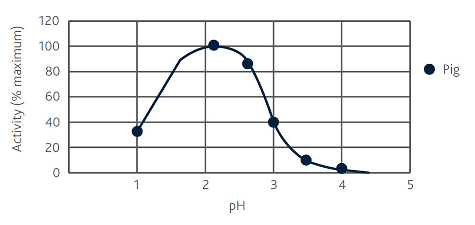 Due to its immature gut system, the piglet’s secretion of digestive enzymes is limited. Specifically, insufficient secretion of pepsin, which is crucial for optimal protein digestion, is a limitation for the digestive capacity in high-performing, young piglets. Undigested protein can reach the hindgut and become a substrate for the growth of pathogenic bacteria, leading to physiological imbalances and serious health issues. Since pepsin has a pH optimum of 2 (Figure 1), organic acids can be used to ensure that this pH optimum in the gastrointestinal tract is met, even in feed with high buffer capacity, such as piglet starter feed.